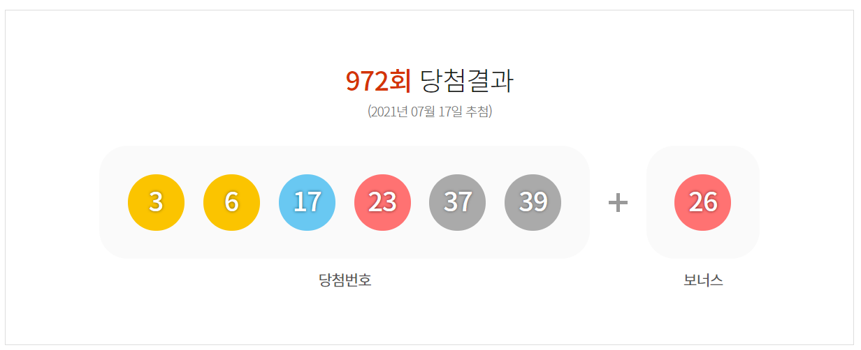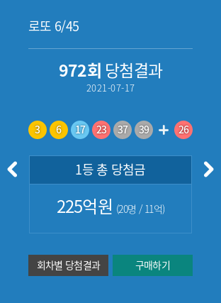 로또 972회 1등 당첨번호 1등 2등 당첨 배출점 확인 로또앱 명인 from blog.kakaocdn.net 로또당첨결과 (당첨번호, 당첨금, 당첨인원, 지급기한, 당첨지역) 최신 당첨번호부터 ~ 원하는 회차의 로또당첨번호를 확인하실 수 있습니다. 번호 배분은 10회 이상 장기 미출수 12개, 5회~9회 장기 미출수 11개로 10회 이상 장기 미출수들이 다시금 우위를 점하게 되었습니다. 마침, 최근 조국 (1965~) 前 법무부장관 의 아내 인 동양대학교 교수 정경심 (1962~) 의 1심 결과 (징역 4년, 벌금 5억 원)가 나왔기에 해당 사건을 검색해 봅시다. 뉴욕증시, 파월 증언 대기·지표 혼조에 하락 출발; 로또972회당첨번호, 통계, 모음, 엑셀, 조회. Jul 15, 2021 · 로또 972회 당첨번호 조회 로또971회 1등 6명, 37억원. 상품 주문, 배송 및 환불의 의무와 책임은 각 판매 업체에 있습니다. 로그인 유지 기능을 사용할 경우 다음 접속부터는 로그인할 필요가 없습니다.